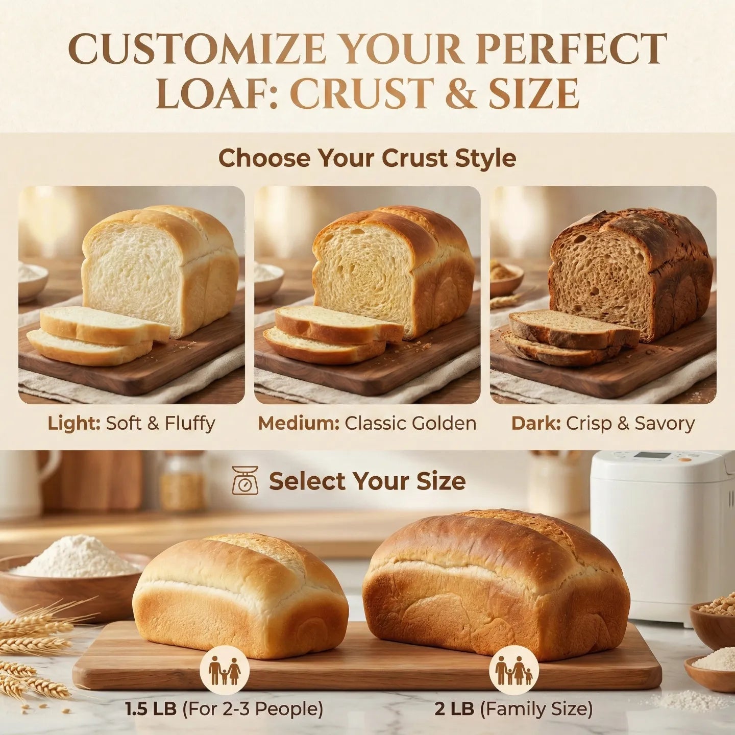 🍞 3 Texture Settings: Light (Soft), Medium (Golden), or Dark (Crispy).
